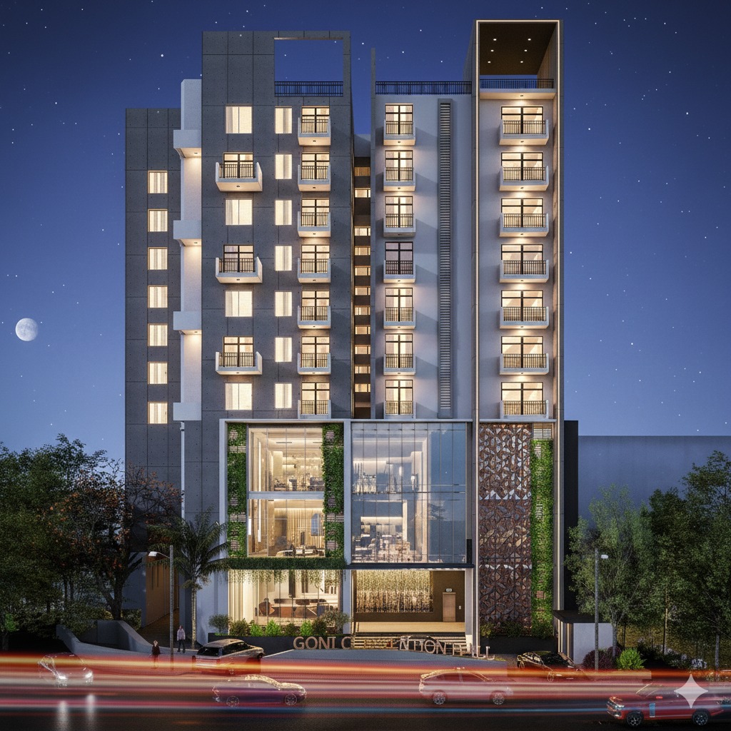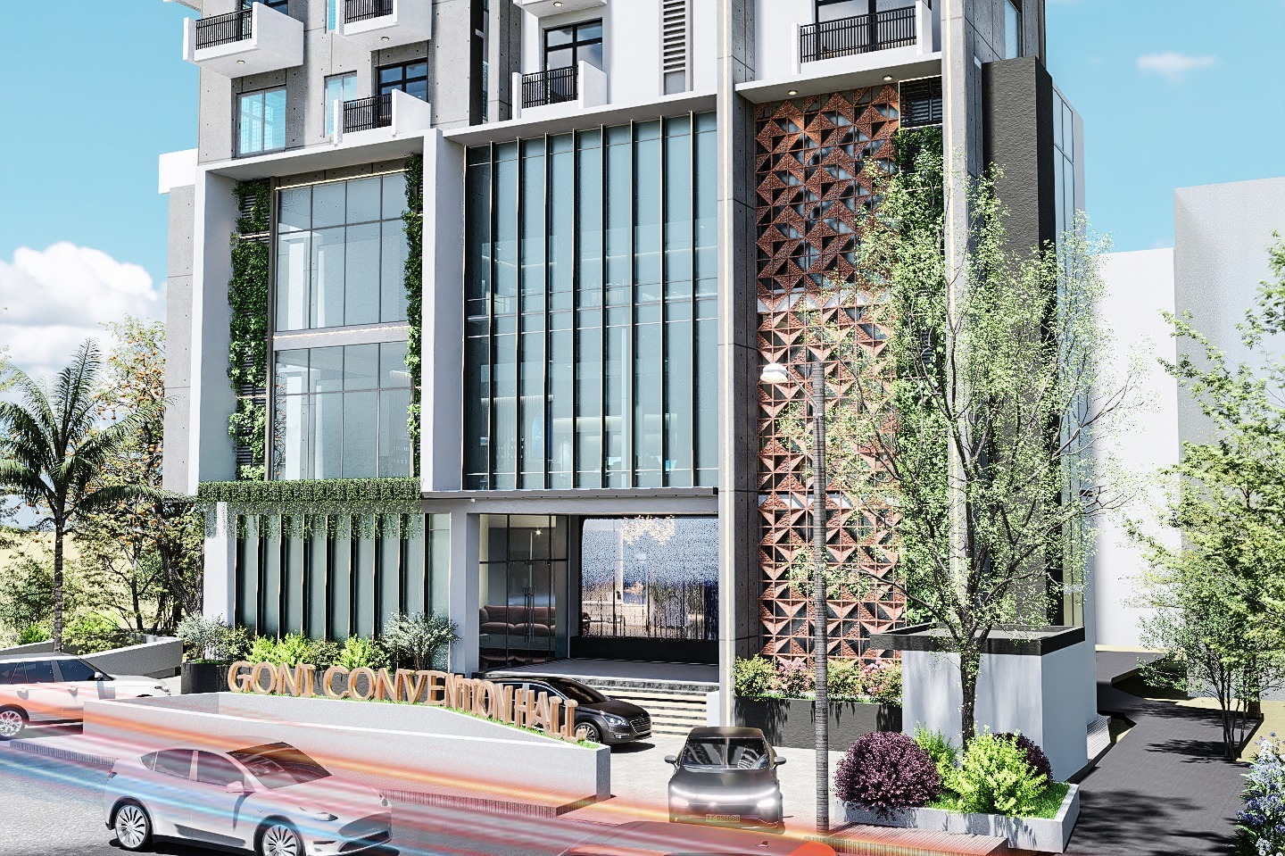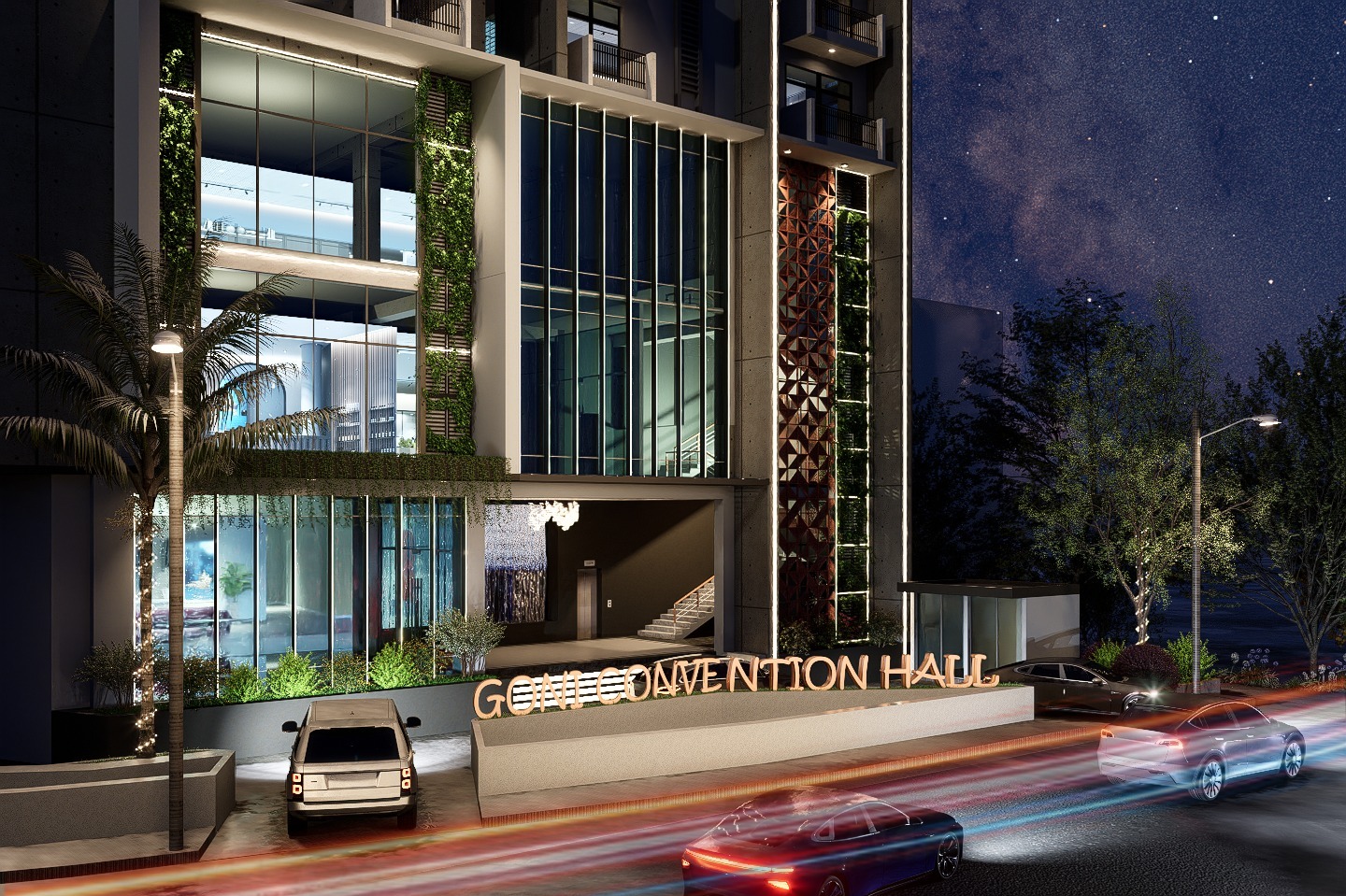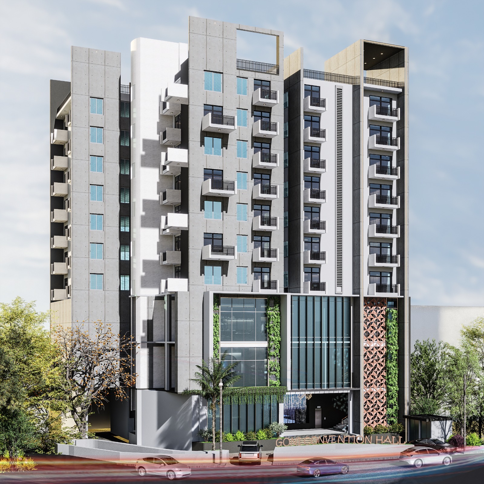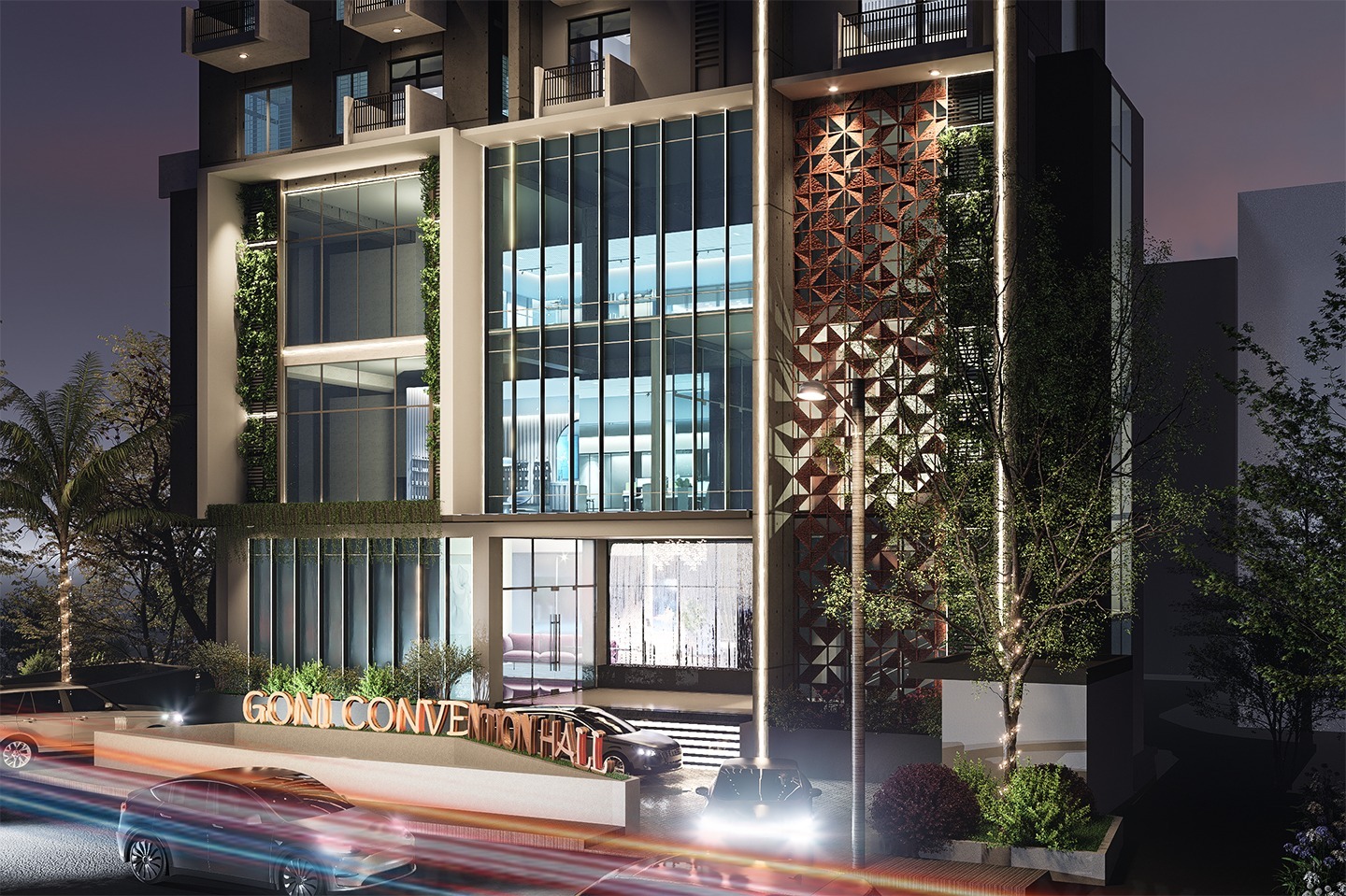 This mixed-use project is designed to accommodate a two-storied convention center along with office spaces, forming a three-level commercial zone that is carefully planned to ensure separate access from the residential entrance, maintaining privacy and functional clarity.